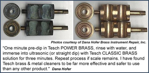 Tesch's new POWER BRASS is a fast-acting acid cleaner that quickly removes heavy scale build-up from slides, valves, etc. And it provides a highly effective alternative to the corrosive, toxic cleaners that have been used in the industry for years.